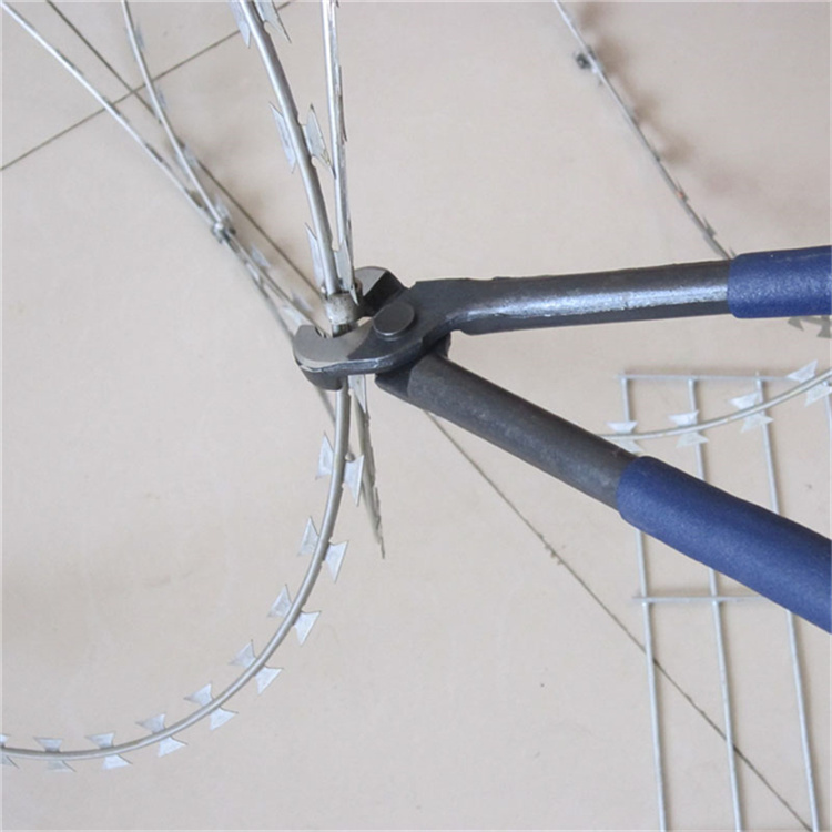 1 、安裝滾刀網(wǎng)在圍墻上,要有配備的支架來支撐刀片刺網(wǎng)易安裝,這樣安裝出來的效果美觀。首先是在圍墻上打眼用螺絲穩(wěn)固刀片刺網(wǎng)立柱 ,一般情況是每隔3米一個(gè)支撐柱子。