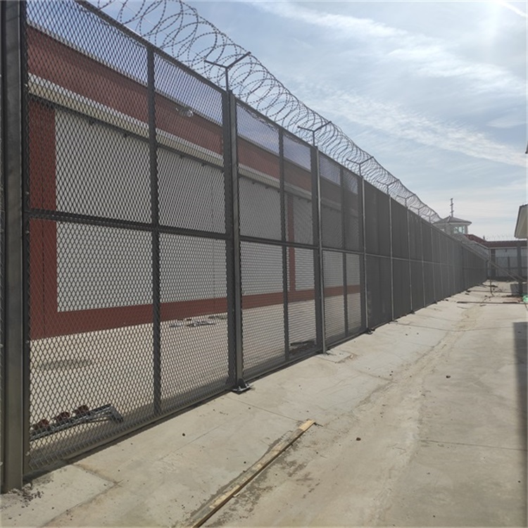 監獄防攀爬隔離網安裝方式:3m一根立柱,頂部安裝V字型支架固定刀刺網,立柱采用4根12號膨脹螺絲固定至地面(地面需是鋼筋混凝土地面)。