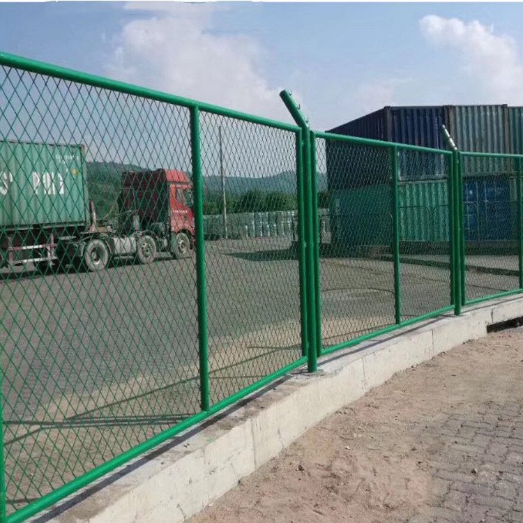 焊接斜方孔保稅區圍網,圍網:絲徑5mm、網孔50*50mm、框:50*50*1.5mm方管、立柱:80*80*3mm方管、尺寸:網寬3m(柱中心)網高2.2m、圍網頂端加三道刺鋼絲表面處理:鍍鋅、浸塑。