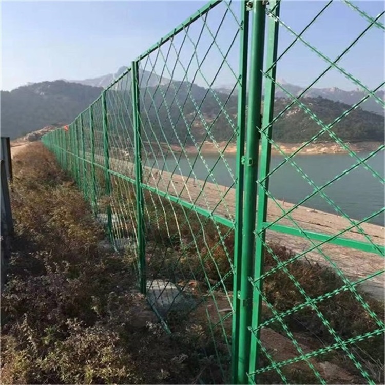 水庫圍欄網產品規格如下(其它規格可根據客戶要求定制): 孔(mm):75x150 片(mm):1800x3000 框(mm):20x30x1.5邊框20X30的方管,與鐵絲網焊接而成 網絲浸塑(mm):0.7-0.8網絲塑后(mm):4.8 立柱尺寸(mm):48x2x2200主要采用普通48圓柱 頂部整體彎折:30° 彎折長度(mm):300 立柱間距(mm):3000 立柱預埋(mm):250-300 預埋基礎(mm):500x300x300400 x400 x400 優點安裝方便,美觀大方,成本低,用途廣。