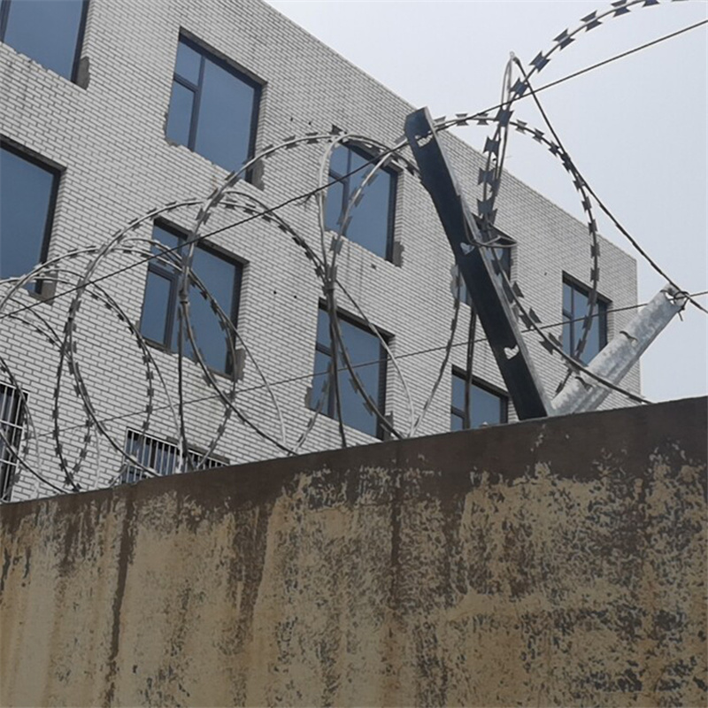 刀片刺網是沖剪鋼板成銳利的尖刀帶子,然后包裹中碳鋼絲(筋絲)之上。刀片刺絲是從海外引進的絕對禁止通過的新型隔離產品。鋒利的刀片刺絲由雙根線扣卡子組裝后成蛇腹狀,讓人看到不寒而粟,能夠起到了恐嚇作用,實際上人挨上刀片刺絲就被劃破,實際效果明顯。該產品施工便利快捷。深受軍隊和警察喜好。各國已將刀片刺網廣泛用于飛機場、軍事重地、邊境線、監獄、政府機關、銀行,以及別墅的圍墻、高速公路、鐵路護欄等地。