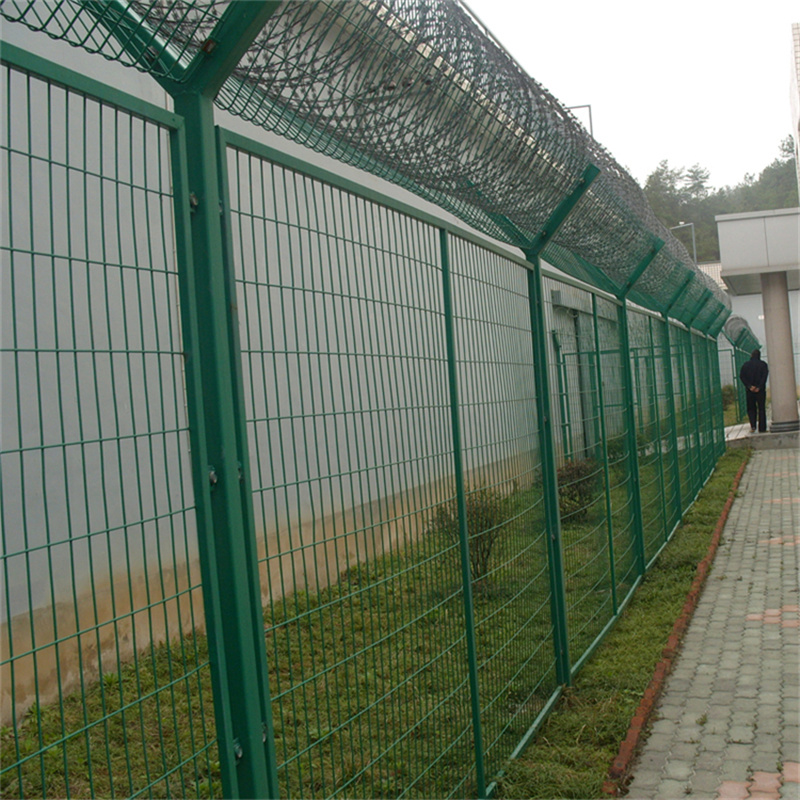 勞教所防護網絲材質都是選用Q235碳素鋼,1、網格大小:50mm*150mm堅密格型網加三道折彎,加固定框2、網片固定框:20*30*1.5mm國標方鋼管,增加一道垂直中稱3、網絲直徑:5mm,網片尺寸:2000mm-2500mm(可根據實際可用空間合理調整)。4、立柱規格:Y型柱直徑60*60*2.5mm方鋼。5、柱與網框連接方式:防盜螺絲貫穿式連接。6、網片頂端安裝刀片刺繩:芯絲直徑2.5mm、刀長21mm,刀寬15mm,刀片刺繩直徑500mm-600mm。
