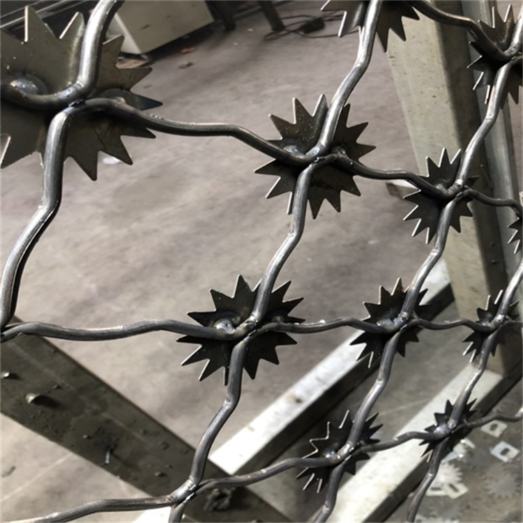 監獄梅花刺片隔離網又叫做監獄梅花刺片護欄網,是一款主要應用于監獄,軍事重地等等安全防護要求特別高的場所,是用氬弧焊將梅花形刺片焊接在美格網的節點上,形成刺形保護,有效的防止了手握腳攀。梅花刺網具有美觀、經濟實用、防阻效果好、施工便利等優異特點。 梅花刺片隔離網防腐形式采用不銹鋼、熱鍍鋅、熱鍍鋅+噴塑等防腐處理方式。