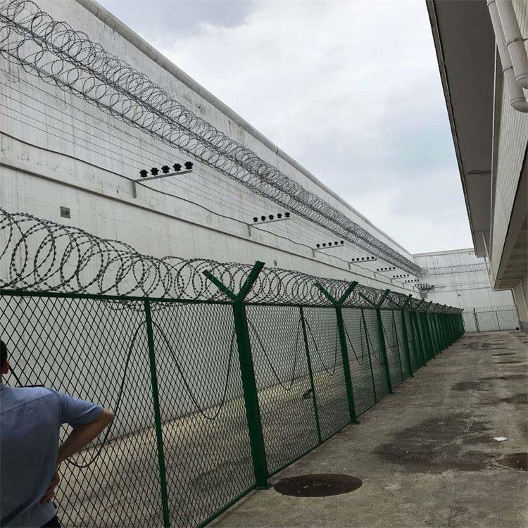 立柱的頂部焊接V型彎頭,這種立柱也叫做Y型立柱,頂部用以架設蛇腹形刀刺網,與下部的監獄防攀爬隔離網完美結合,形成一道難以逾越的銅墻鐵壁。