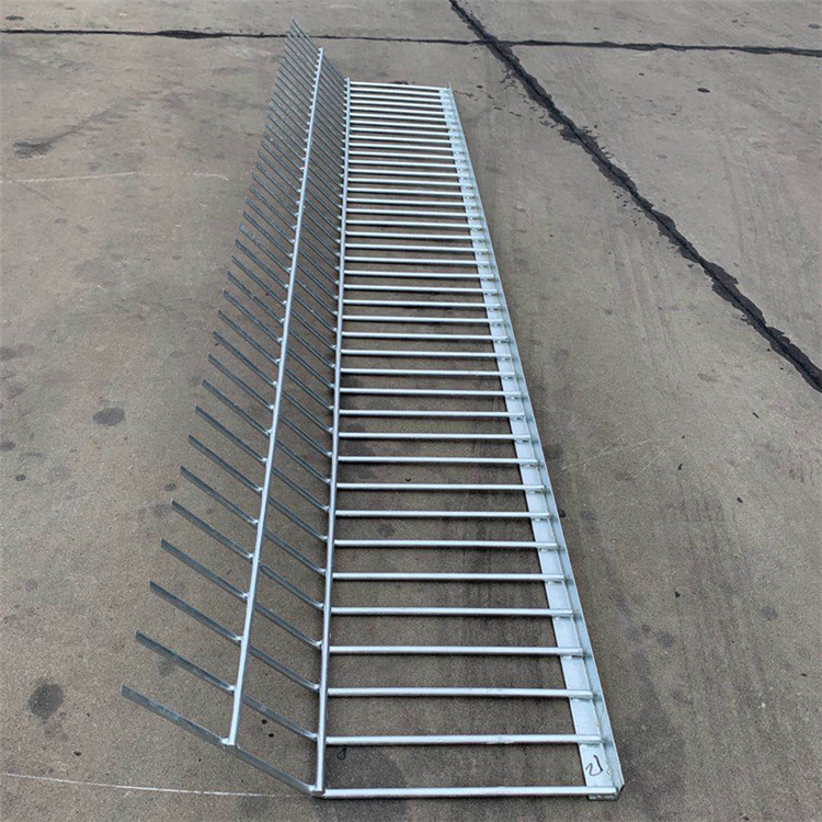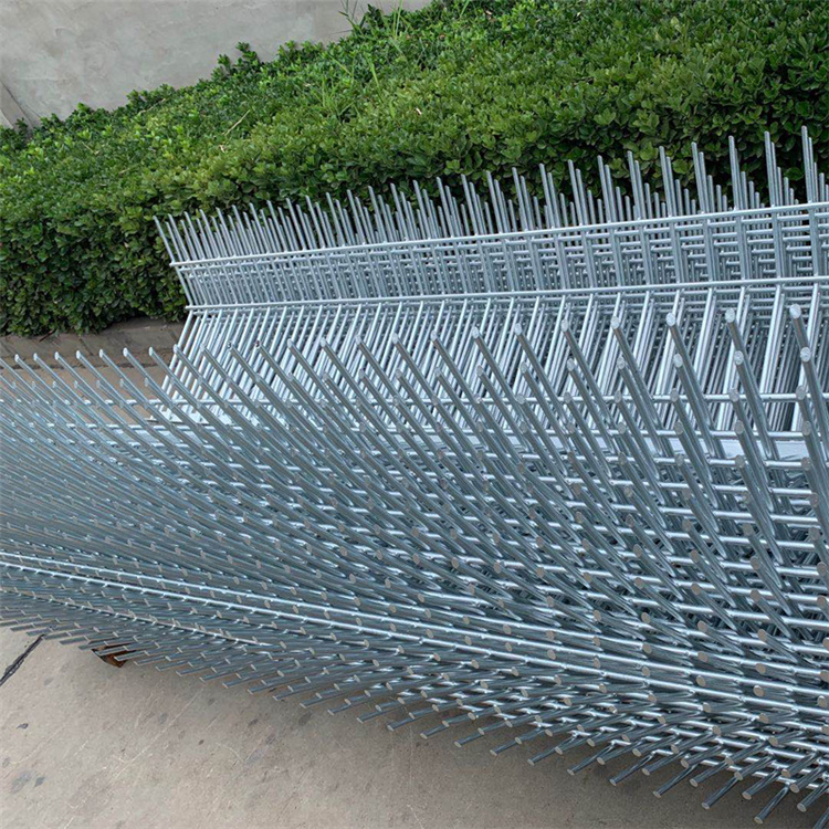 這是我廠新生產出的鐵路防爬刺圍墻加高刺網產品,采用10個粗鋼筋焊接成鋼筋網片,孔小不可防攀爬和翻越每根鋼筋的頂部都焊接刺尖。表面處理采用整體熱鍍鋅,使用年限在15年以上,增加圍墻高度的同時,也有防攀爬效果。