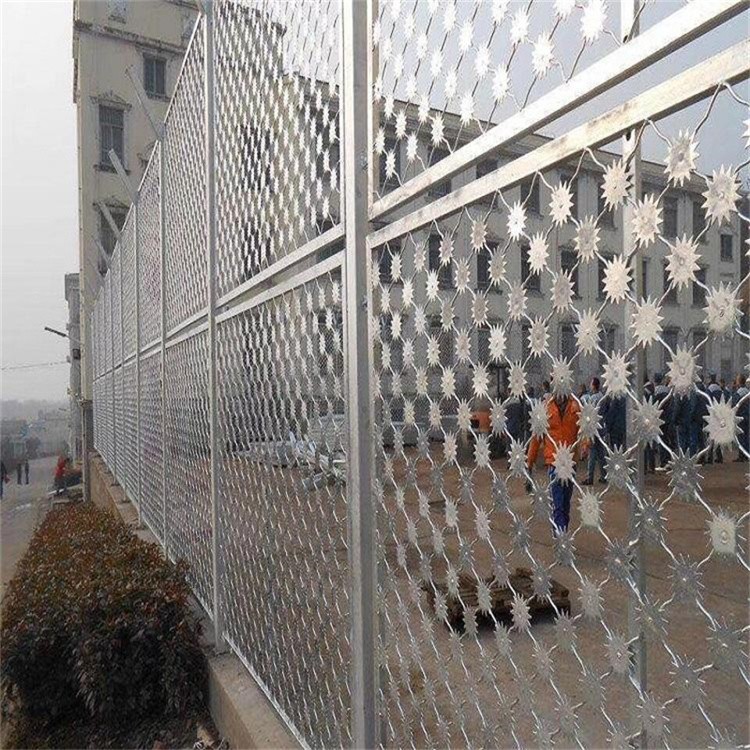 5、刀片滾網、拉絲、卡扣,均采用不銹鋼材質。刀刺網安裝固定卡扣整體調正,使刀刺網不出現擰轉情況,刀刺刺圈分布均勻,每隔30-40cm與拉絲固定;分段連接處需將兩端刀刺網做連接固定,刀刺網固定點需緊鎖不得出現松動、脫落現象;刀刺網安裝與隔離網平行,上下左右均成直線延伸,轉角處需做加密加固處理。
