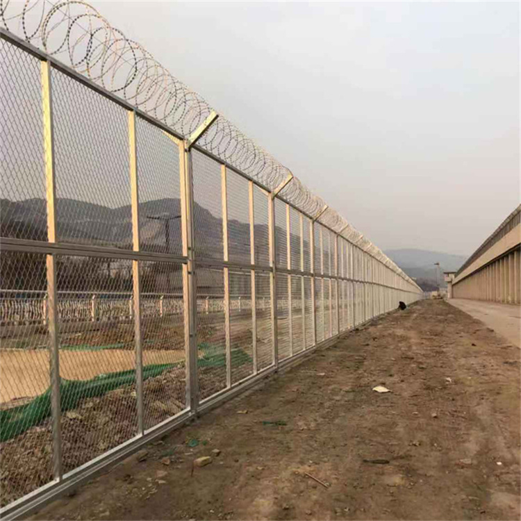 機場飛行區圍界可采用角鋼隔離圍界又被稱為刀片刺籠隔離網,立柱頂端呈Y字型,上面架設刀片刺繩,提高了隔離柵的防御等級。該產品的網面與三角折彎隔離柵的網面是相同的,經過折彎處理增加強度四周焊接50x50角鋼,并且減少單調乏味。為了避免攀爬發生,頂端加設刺絲滾籠,這樣會增加嚇阻作用,起到防范,并且在外型上形成獨有的特點,令人過目難忘。