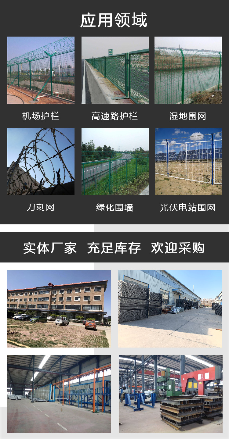 一般圈地圍欄網用哪種鋼絲網合適?經常有客戶打電話圍地護欄網,要求鋼絲網結實耐用并且價格不能太高,針對這些客戶的需求我們給他推薦雙邊絲護欄網,雙邊絲護欄網是常規的圈地用鋼絲網,1.8m高,網面帶有防攀爬彎頭,網孔8*16cm,絲徑4mm顏色草綠色,非常美觀,表面浸塑處理,防銹效果好。需要圈地圍欄網的可以選用雙邊絲護欄網,經濟實用。歡迎新老客戶來我廠參觀,大量現貨,現貨現貨。歡迎選購!