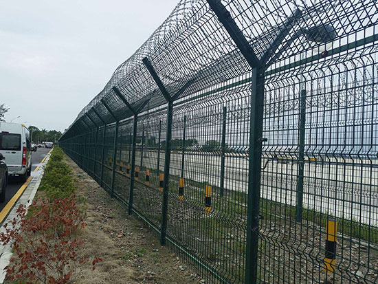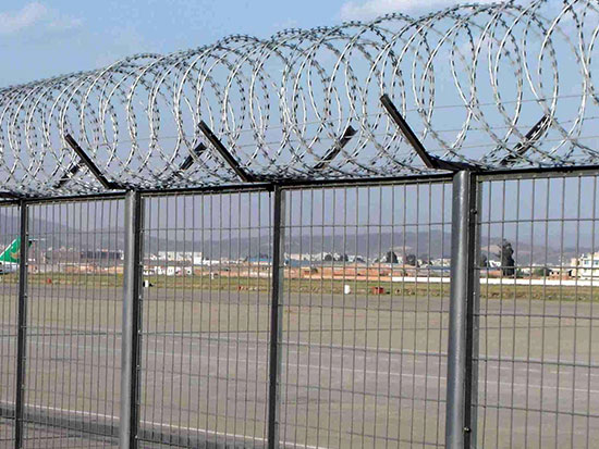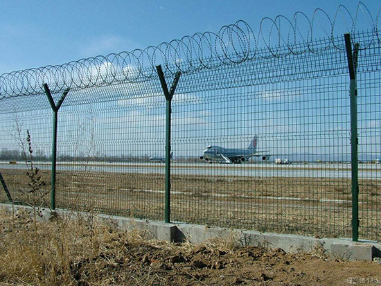 機場圍界網頂部加裝刀片刺絲、刀片刺網后又很好的增強了安全防護性能。其產品造型美觀、花色多樣,既起到圍欄作用,又起到美化作用。由于具有安全性高、防攀爬能力好,網片連接方式采用特制SBS緊扣件,有效防止人為的破壞性拆卸,橫向四道折彎加強筋,使網面強度顯著增加。