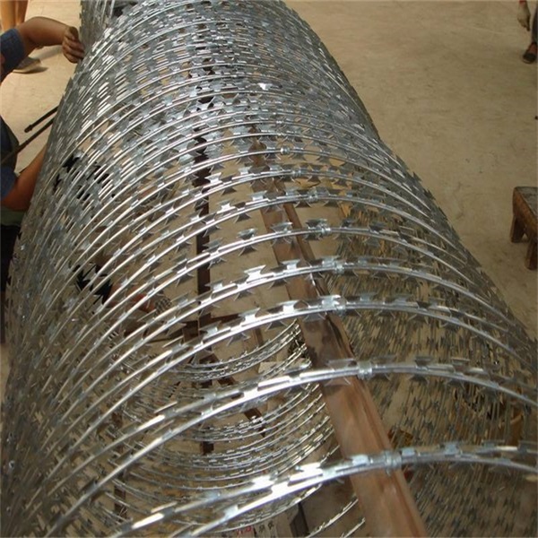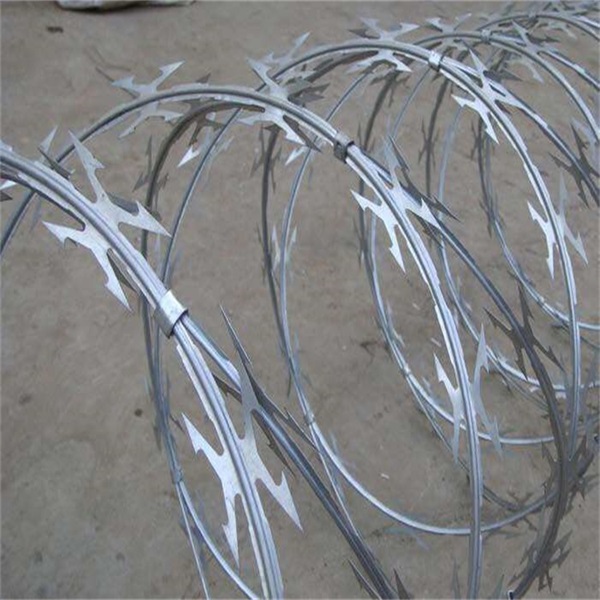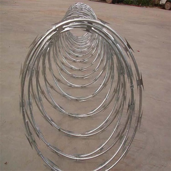 蛇腹型刀刺網(wǎng),由于各區(qū)域文化名稱差異也被叫做滾刀網(wǎng),蛇腹式刀刺網(wǎng)材料有中碳鋼絲、冷軋鍍鋅薄板,不銹鋼板,不銹鋼絲。蛇腹型刀片刺網(wǎng),上、下懸掛0.5米的交叉蛇腹型刀片刺網(wǎng),刀片刺網(wǎng)采用鋼板沖壓成型包附于鋼絲(筋絲)之上,由銳利尖角鋅鋼板或不銹鋼薄板做刀片,高張力鋼絲做芯線組合而成的。鋒利的刀型刺由雙線扣裝后成蛇腹?fàn)罴让烙^又讓人不寒而粟。起到了很好的阻嚇作用。刀片刺網(wǎng)硬度好,制造及特點(diǎn):鋼絲為芯絲,將沖壓好的刀片包裹在芯絲上,一次制成。產(chǎn)品具有超強(qiáng)的防護(hù)能力和恐嚇能力,安裝方便,壽命長(zhǎng)。蛇腹型刀刺網(wǎng)的直徑常用的是500mm、600mm、800mm,其他規(guī)格均可定做,艾瑞廠家保證產(chǎn)品品質(zhì)。