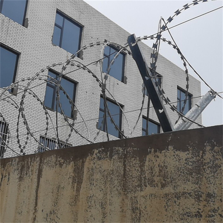 圍墻防護網之圍墻刀刺網是由v型支架和刀片刺籠及鍍鋅刺繩組成。