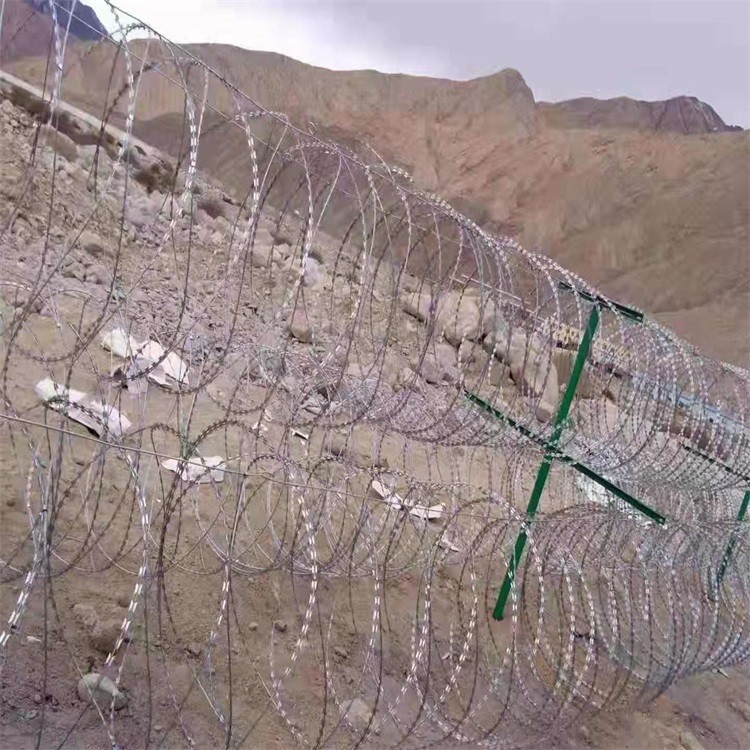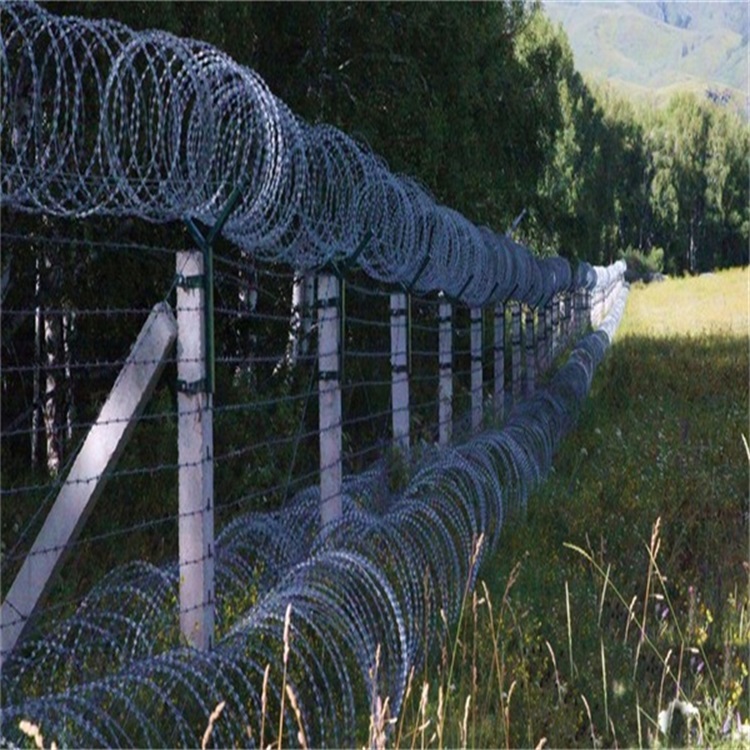 4、211型邊境鐵絲網(wǎng),鐵絲網(wǎng)的結(jié)構(gòu)是下面兩道上面依次跺起來1道,從下到上總共是3道鐵絲網(wǎng)。接下來我們?cè)敿?xì)說明一下211邊境鐵絲網(wǎng),此結(jié)構(gòu)的鐵絲網(wǎng)下面兩道采用直徑是90公分的刀片刺網(wǎng)之后上面在放一道直徑90公分的刀片刺網(wǎng),上面安裝一道直徑是60公分的刀片刺網(wǎng)。架設(shè)的立柱類似干字型支架,架設(shè)立柱高2.4米,立柱采用Q235材質(zhì)50*50*2mm方管,柱高2.4m;橫向支架用40*40*3.5mm角鐵,橫向支撐3道,表面處理浸塑防腐處理、墨綠色。