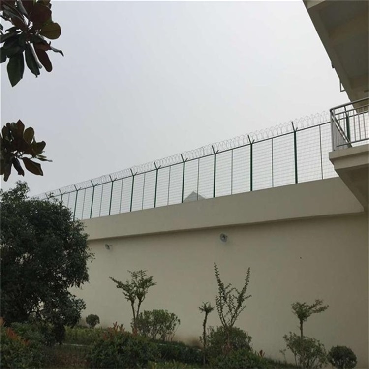 監獄隔離網墻頂部按照要求安裝蛇腹形刀刺網,立柱頂部的V型直接兩個側臂焊接有專用的刺網勾,是每個側架設三道熱鍍鋅鋼絲,形成一個v型槽,然后把刀刺網放到上面,再用配套卡扣把鋼絲和刀刺網連接到一起,如果v型架內安裝V型網架,安裝就更簡單了,直接把刀刺網連接到v型網上面就可以了。