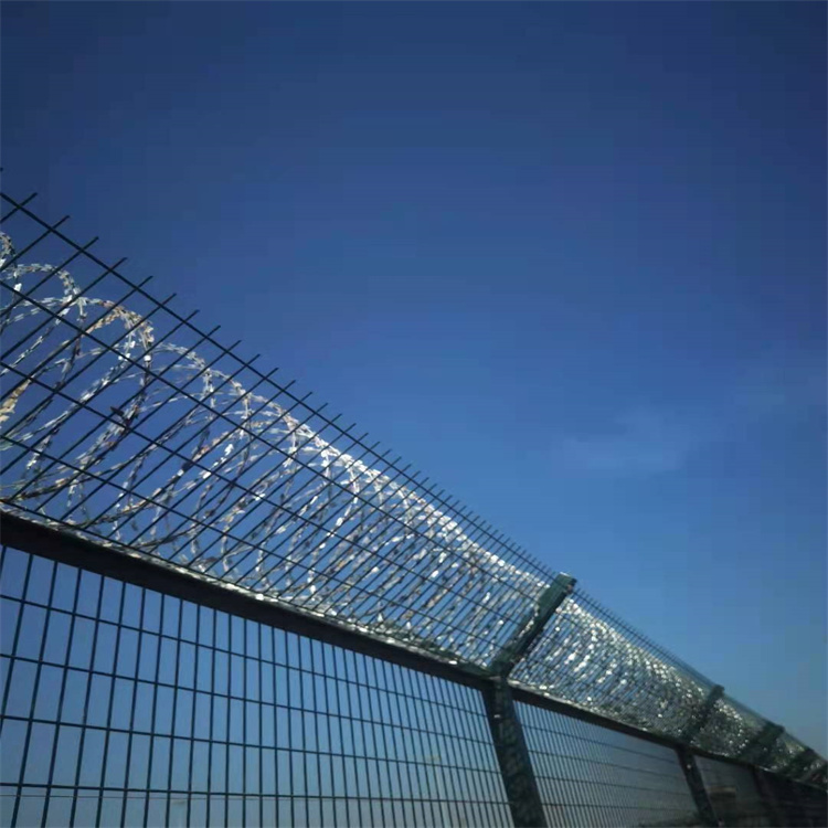 機場護欄和監(jiān)獄護欄樣式基本上是一個類型的,上面是Y型架托著蛇腹型刀片刺繩,下面是護欄網(wǎng)片,這種護欄高度一般為2.5m-4m,寬度為2.5-3m,高度相較于別的護欄來說相對高的,應(yīng)用的場所也比較嚴格,造價也相對于來說比較高,但是質(zhì)量很好,顏色一般有白色,草綠色,墨綠色,銀色等,網(wǎng)孔一般為50-150mm,邊框為30*50mm的,立柱為80*80mm,方管厚度也比較厚,絲徑一般塑前4.0,塑后5.0mm,機場護欄安裝后可以有效隔離人群,防止攀爬和翻越的行為,為保護機場和人員安全起到很大的作用,安裝很有必要。