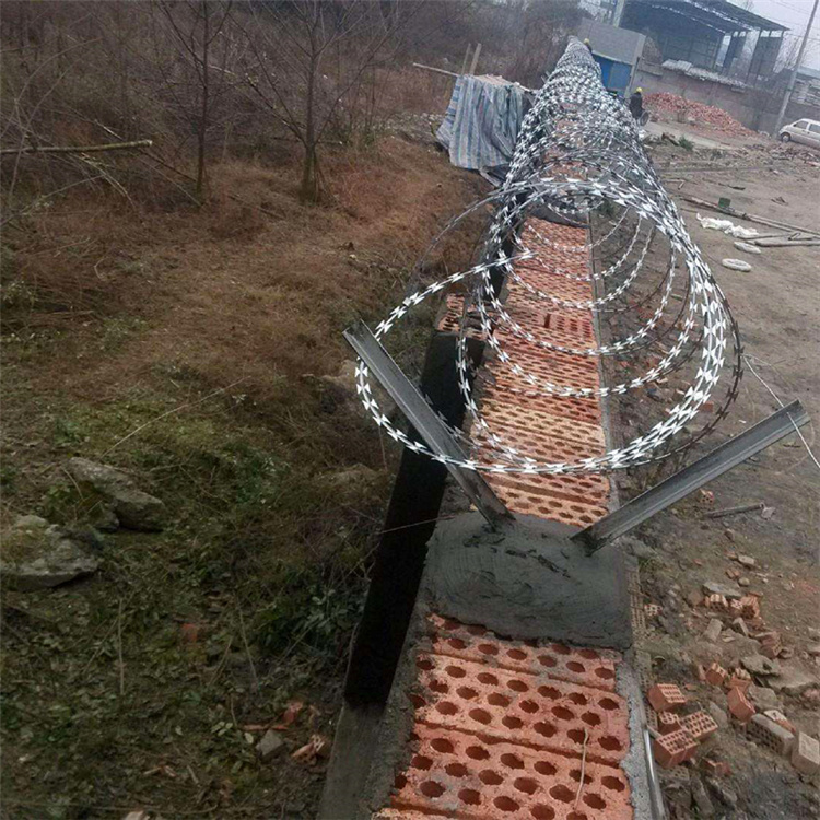 刀片刺網(wǎng),是一種防護、隔離能力較強的防護產(chǎn)品,采用優(yōu)質(zhì)鋼片沖壓尖刺包裹高強度 鋼絲壓制而成,雙線用卡扣銜接固定,呈現(xiàn)螺旋型,既美觀又讓人不寒而栗,起到了很好的 阻嚇作用。已被廣泛用于軍事重地、監(jiān)獄、政府機關(guān)、銀行、生活小區(qū)圍墻、私人住宅、別 墅圍墻、鐵路柵欄加高以及邊境線等的安全防護。可以在圍墻上單獨使用,也可以搭配隔離 網(wǎng)在頂部架設(shè)。
