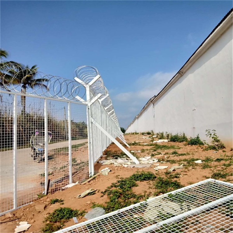 監(jiān)獄圍墻隔離網(wǎng)上部裝置刀片刺網(wǎng)(刺絲滾籠),刀片刺網(wǎng)具有嚇阻、防翻越等效果,原料堅硬,高強度,高張力,造型規(guī)劃共同,不宜接觸,因而能到達非常好的防護阻隔效果。巡查道阻隔網(wǎng)還具有施工簡便,經(jīng)濟實用等長處。