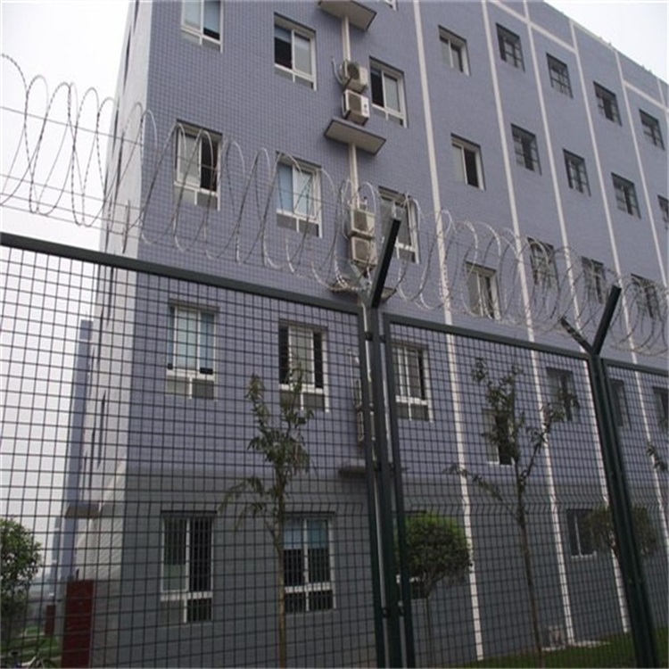 飛行區鋼網墻用V型支架在 頂部加裝蛇腹型刀刺網,形成一道難以逾越的隔離墻屏障,從而有效地增加飛行區鋼網墻的防攀爬性和安全性。