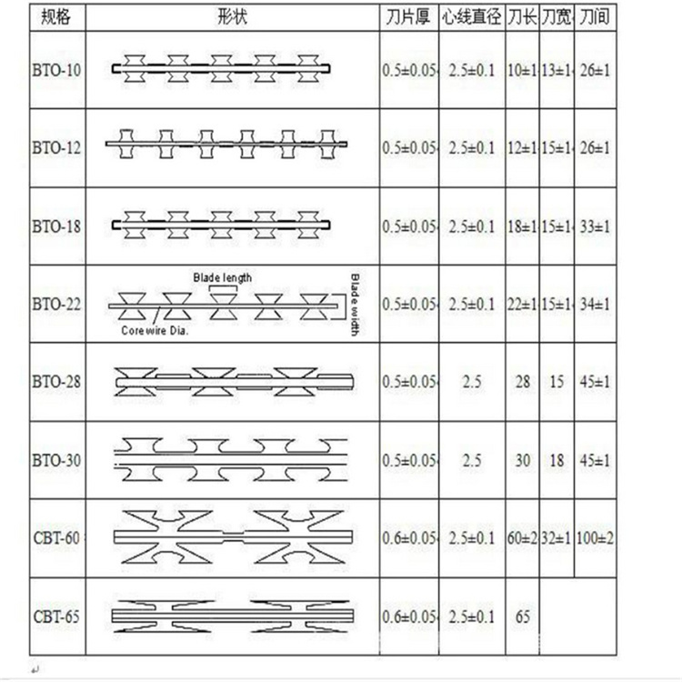刀刺網(wǎng)安裝間距不宜少于250px,圈距排列應(yīng)均勻,刀片形式宜為BTO-22(芯線直徑2.5mm±0.1mm,刀片厚0.5mm±0.05mm,刀片長(zhǎng)22mm±1mm,刀片寬度15mm±1mm,刀片間距36mm±1mm),用于支撐刀刺網(wǎng)的支架伸出刀刺網(wǎng)長(zhǎng)度不應(yīng)大于50)mm;