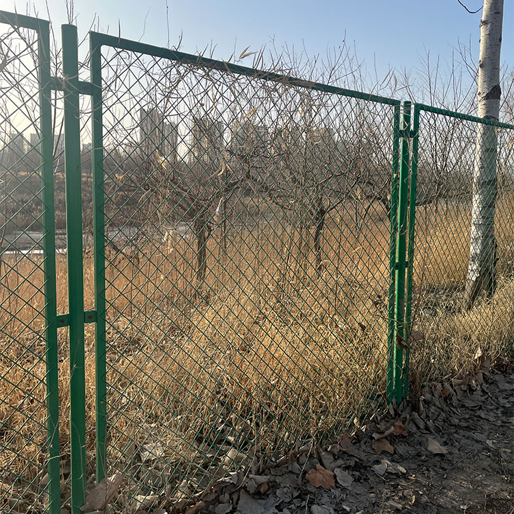 5.廠區框架護欄網網孔150*75mm,鐵絲直徑浸塑前3.8mm,鋼管直徑48mm,浸塑前壁厚1.2mm,向外傾斜30度.廠區框架護欄網若地面高差超過5cm或有溝渠可先進行平整,坡度平緩后按施工方案圖坡底填土處理,地面情況復雜地區可根據實際情況斷調整.