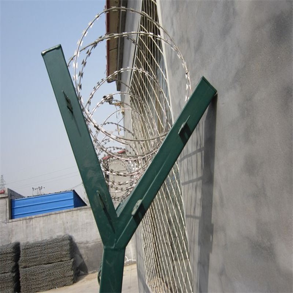 4、在刀片刺鋼網墻的Y字型支架的兩邊各拉一根鋼絲,對刺網進行再固定,以免左搖右晃。刀片刺鋼網墻得收放∶刀片刺鋼網墻每2圈有3-7個卡扣,而且是圈圈相卡,拉開以后形成螺旋狀,拉伸的時候注意一定要帶防護手套,預防劃傷。拉開的時候只需要固定刺網的一邊,然后向相反方向拉開就行,注意孔的間距不要太大,不然影響美觀效果。收的時候只要慢慢的送回去就行,操作簡單,施工便利。