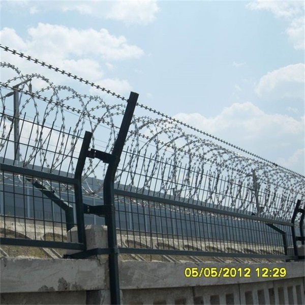 (3)、刺絲滾籠由刺絲連接卡扣與固定在支架上的隊(duì)向拉筋相連接,縱向拉筋與支架的連接采用ø2.5mm的冷拔鍍鋅鋼絲繞2圈后擰緊固定,支架設(shè)置在跨度3m防護(hù)柵欄的立柱和跨中位置,其他跨度僅設(shè)置與立柱上部,支架與防護(hù)柵欄采用支架抱箍連接。