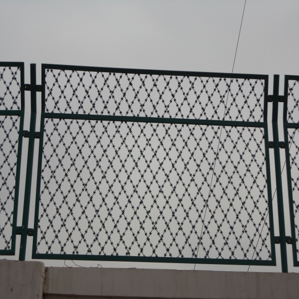 監(jiān)獄圍墻網(wǎng)又稱作“Y型安全防御護(hù)網(wǎng)”,由V型支架立柱加強(qiáng)型焊接片網(wǎng),安全防盜連接件和熱鍍鋅刀片刺籠組成強(qiáng)度和安全防御性級別很高,被廣泛應(yīng)用在監(jiān)獄,看守所,機(jī)場,軍事基地等高安全場所。