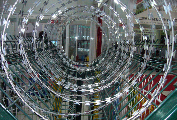 圍墻防護刀刺滾網 常用的是BTO-22刺絲滾籠,每三米一組熱鍍鋅支架,表面采用...可分為兩種,一種是全熱鍍刀片刺繩,一種是半熱鍍刀片刺繩,價格只是稍微低于全熱鍍,除非是一次性使用,否則不推薦。 [ 查看詳情 ]