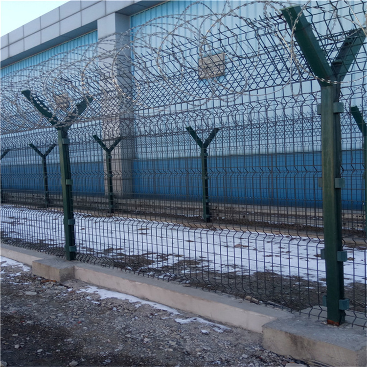 監獄防護網又稱監獄護欄網或監獄隔離柵,主要是采用高強度的刀片刺網與普通防護網的結合,由V型支架立拄,加強型焊接片網,安全防盜連接件和刀片刺網組成.刀片刺網是一種新型防護網,由銳利尖角鍍鋅鋼板或不銹鋼薄板做刀片,鋼絲做芯線組合而成的防護器材。