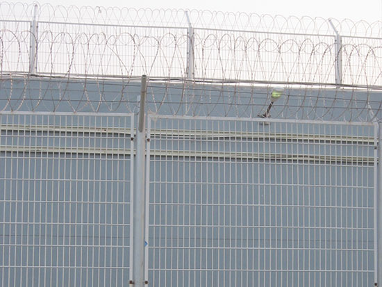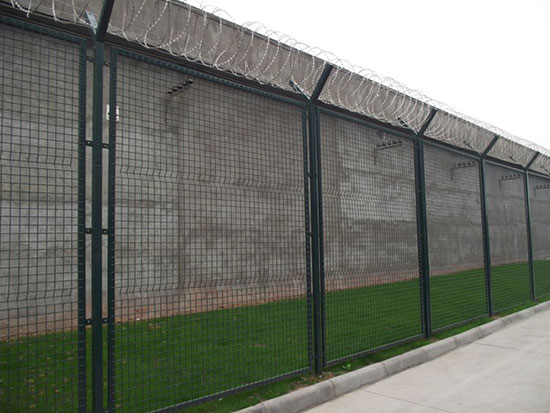 監獄鋼網墻:一般鋼網墻高度3--5米,立柱跨度為2.5米--3米。是由防盜美格網加焊防爬刺片而成,美格網的網孔一般為:100X100mm,絲徑為:5-8mm,刺片直徑50-150mm,形狀似太陽,四周布滿刺尖。焊接在美格網每一個交接點處,是由二氧化碳保護焊進行焊接的,網邊框為20X30mm、40X60mm、鍍鋅方管,壁厚不得少于1.5mm,然后把焊接打磨好的邊框與網片連接,再經過靜電噴涂就算成品了。