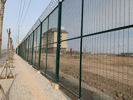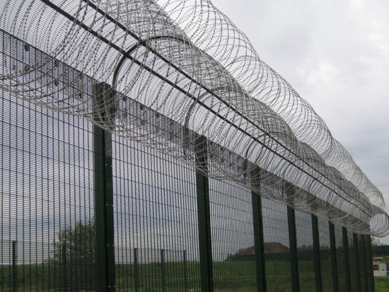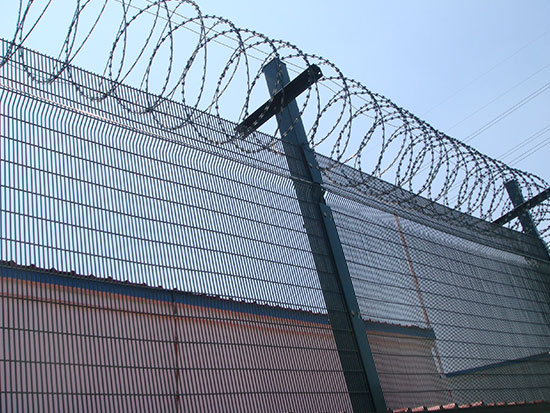高安全隔離網主要是采用高強度的刀片刺網與普通防護網的結合,由V型支架立拄,加強型焊接片網,安全防盜連接件和刀片刺網組成.刀片刺網是一種新型防護網,由銳利尖角鍍鋅鋼板或不銹鋼薄板做刀片,鋼絲做芯線組合而成的防護器材.