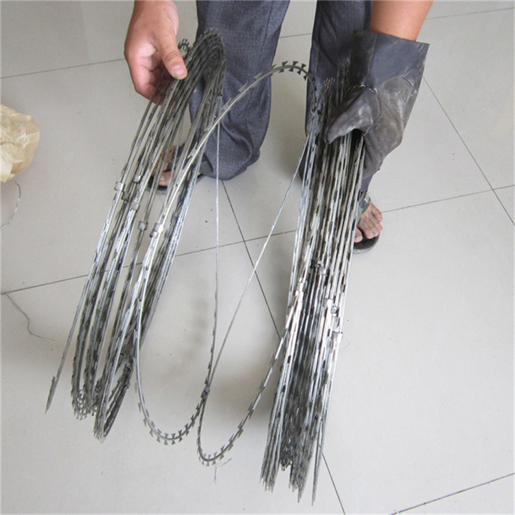 1,制作刀片:選用優質Q195L熱鍍鋅帶鋼(或者不銹鋼帶鋼),根據客戶選定的花型,經高速沖床,沖軋成鋒利的刀片刺條,把刀片刺條纏成圓餅狀。