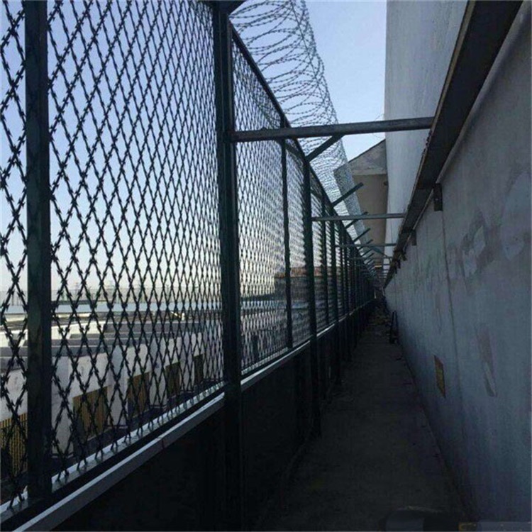 10、金屬網(wǎng)墻的頂部應(yīng)設(shè)一道蛇腹型刀刺網(wǎng),蛇腹型刀刺網(wǎng)材質(zhì)宜為304 不銹鋼,圈徑宜為 600mm,每米長(zhǎng)度不應(yīng)少于 7 圈,圈距排列應(yīng)均勻,刀片形式宜為 BTO-22(芯線直徑 2.5mm±0.1mm,刀片厚 0.5mm±0.05mm,刀片長(zhǎng) 22mm±1mm,刀片寬度 15mm±1mm,刀片間距 36mm±1mm),用于支撐刀刺網(wǎng)的支架伸出刀刺網(wǎng)長(zhǎng)度不應(yīng)大于 50)mm;