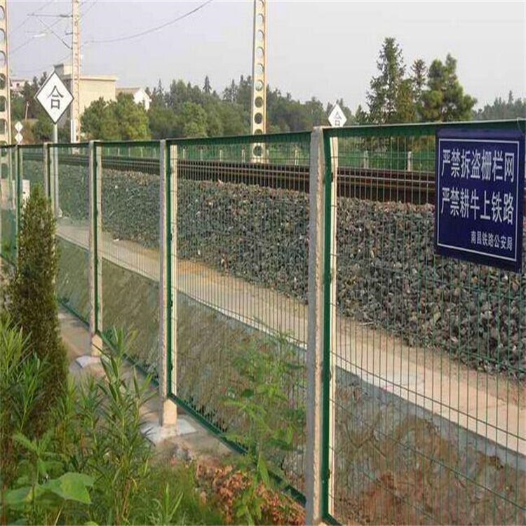 ⑵設置地段要求:新建鐵路應設置在用地界以內0.5米,一般地段防護柵欄高度1.8米,在交通密集地段高度2.2米,防護柵欄設置在路肩上時,高度1.8米。防護柵欄設置在路肩上時,設置距離應滿足傾倒后不侵線及碰車要求。防護柵欄的設置應結合綠化情況,考慮景況的整體效果,在設置聲屏障地段,不設置防護柵欄,應與其順接。防護柵欄跨越水溝等設施時,下部應采用鐵絲網封閉。防護柵欄每隔30米設置警示標志。需設置警示標志的立柱上預制內凹的“禁止攀爬”字樣,采用黑體字形,字高80mm,內部涂黑色油漆。