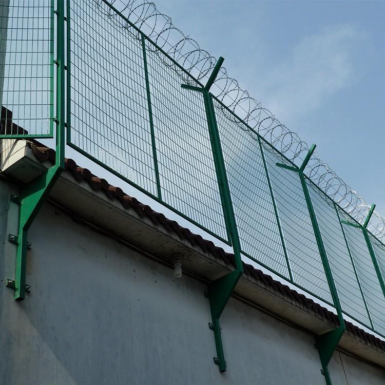監(jiān)獄隔離網(wǎng)墻頂部按照要求安裝蛇腹形刀刺網(wǎng),立柱頂部的V型直接兩個(gè)側(cè)臂焊接有專用的刺網(wǎng)勾,是每個(gè)側(cè)架設(shè)三道熱鍍鋅鋼絲,形成一個(gè)v型槽,然后把刀刺網(wǎng)放到上面,再用配套卡扣把鋼絲和刀刺網(wǎng)連接到一起,如果v型架內(nèi)安裝V型網(wǎng)架,安裝就更簡(jiǎn)單了,直接把刀刺網(wǎng)連接到v型網(wǎng)上面就可以了。