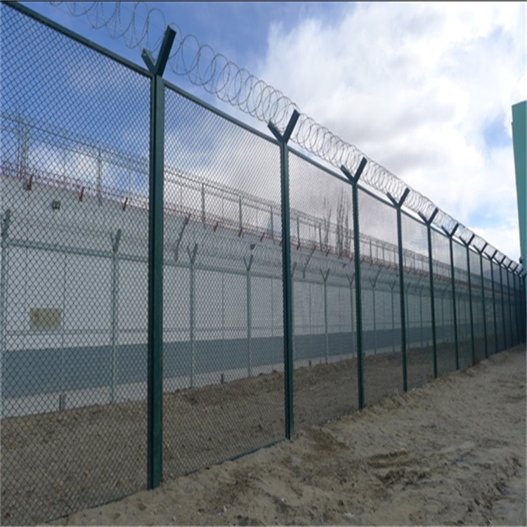 立柱的頂部焊接V型彎頭,這種立柱也叫做Y型立柱,頂部用以架設蛇腹形刀刺網,與下部的監獄防攀爬隔離網完美結合,形成一道難以逾越的銅墻鐵壁。