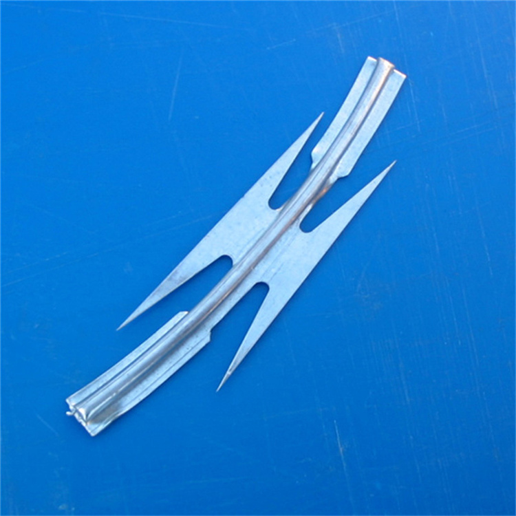 螺旋型交叉式刀片刺絲是在兩條刀片刺絲之間以不銹鋼片和鍍鋅鋼片強力夾和,展開后即成交叉狀,取其美觀又實用。